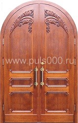 Двустворчатая металлическая дверь с резьбой и аркой из массива АР-13